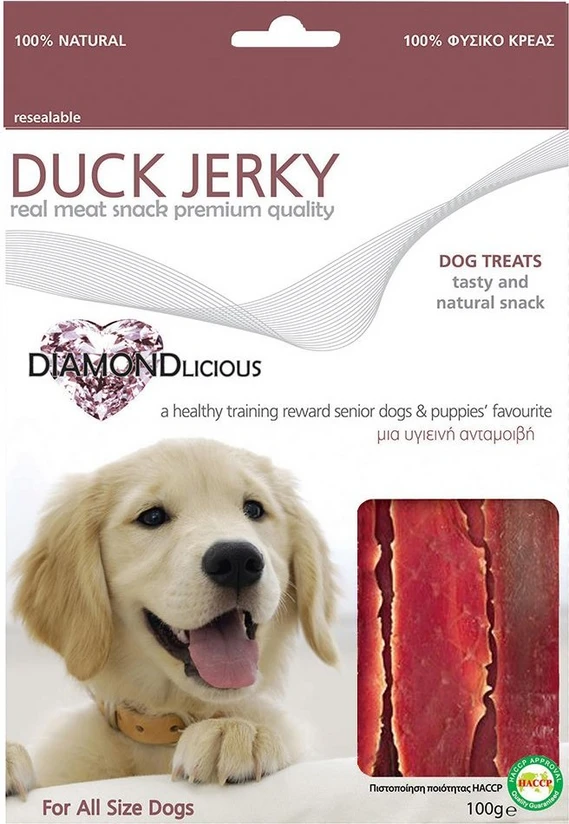 Το Duck Jerky της σειράς Diamondlicious της Pet Camelot είναι ένα 100% φυσικό σνακ κρέατος υψηλής ποιότητας (premium quality), φτιαγμένο από πραγματικό φιλέτο στήθους πάπιας. Η πάπια θεωρείται συχνά μια “εξωτική” πρωτεΐνη, καθιστώντας αυτή τη λιχουδιά ιδανική για σκύλους με ευαισθησίες ή αλλεργίες σε πιο κοινές πρωτεΐνες όπως το κοτόπουλο. Προσφέρει μια νόστιμη και υγιεινή ανταμοιβή με πλούσια γεύση.