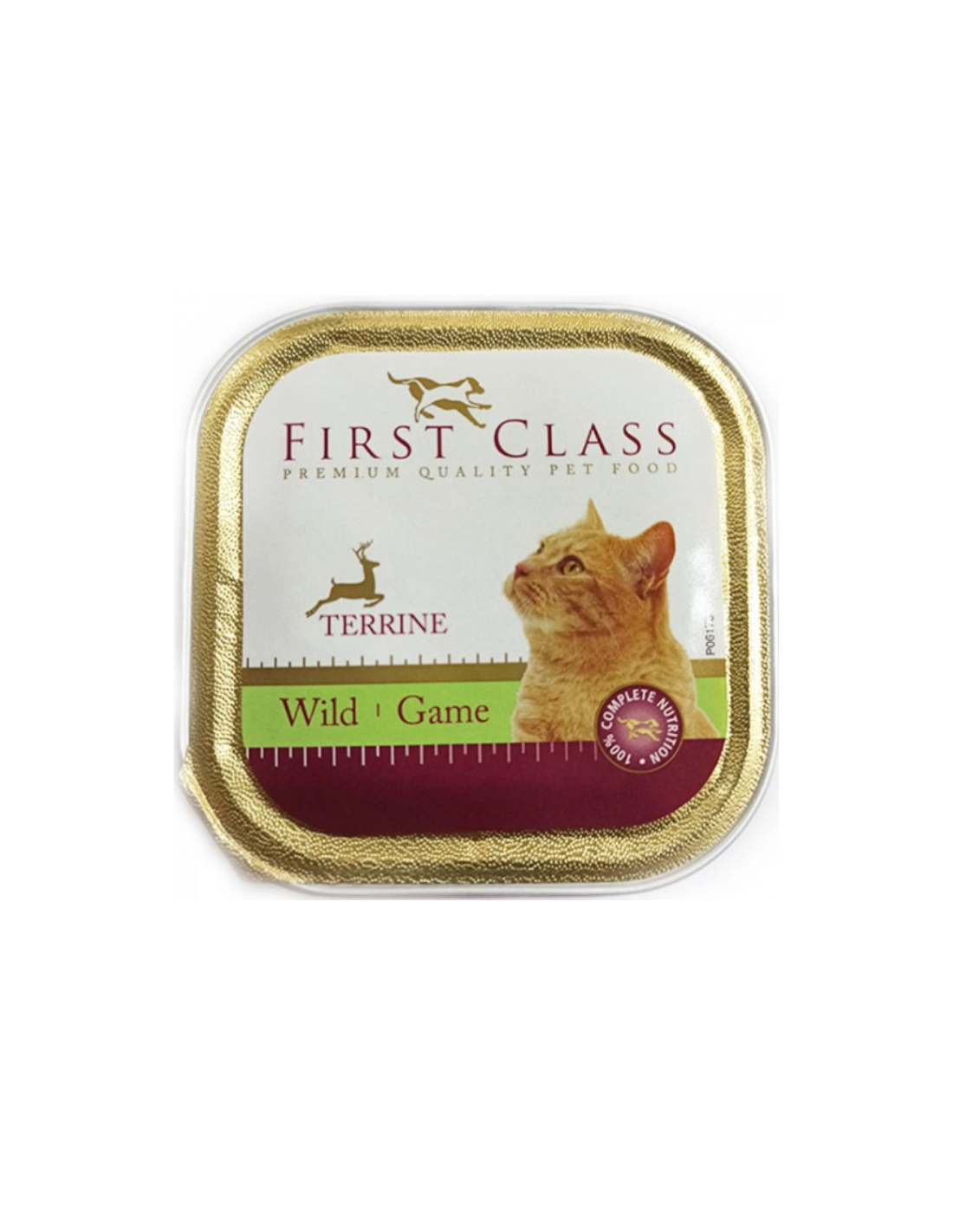 Το First Class Πατέ με Κυνήγι είναι μια πλούσια και θρεπτική υγρή τροφή για ενήλικες γάτες, φτιαγμένη με επιλεγμένα κομμάτια άγριου κρέατος.