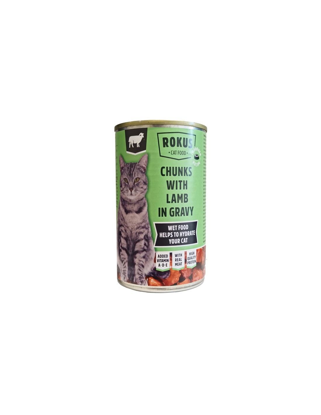 Η Rokus με Αρνί είναι πλήρης υγρή τροφή για ενήλικες γάτες, σε μορφή κομματιών σε σάλτσα.