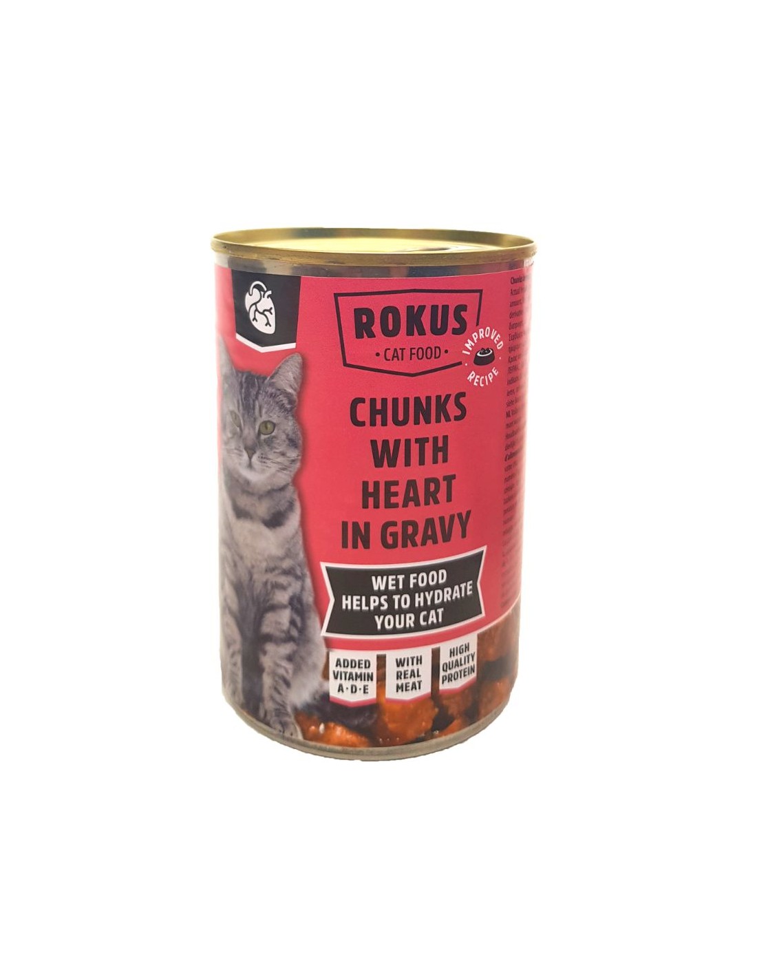 Η Rokus με Καρδιές είναι πλήρης υγρή τροφή για ενήλικες γάτες, με τρυφερά κομμάτια κρέατος σε νόστιμη σάλτσα.