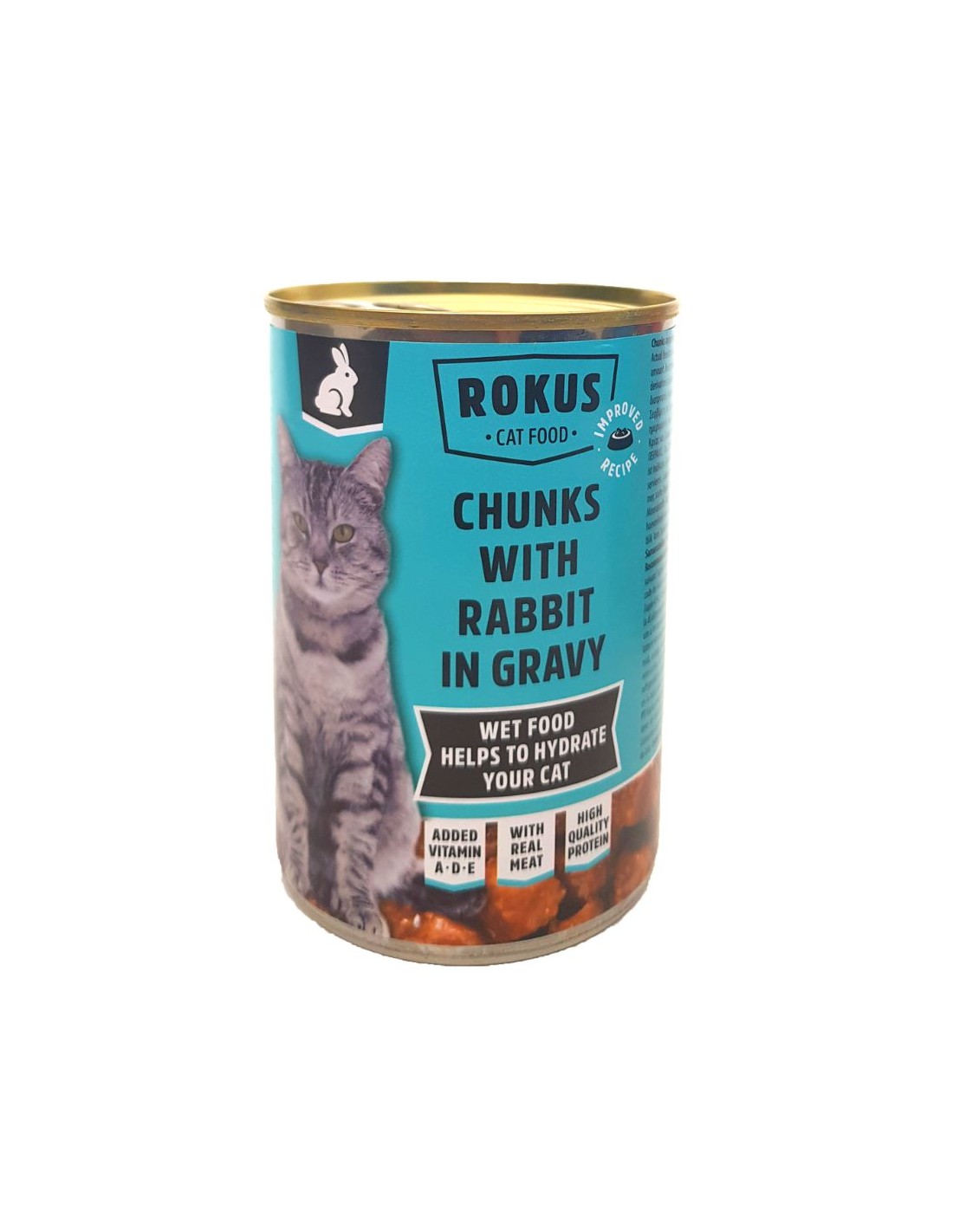 Η Rokus με Κουνέλι είναι πλήρης υγρή τροφή για ενήλικες γάτες, με κομμάτια από κρέας κουνελιού σε νόστιμη σάλτσα.