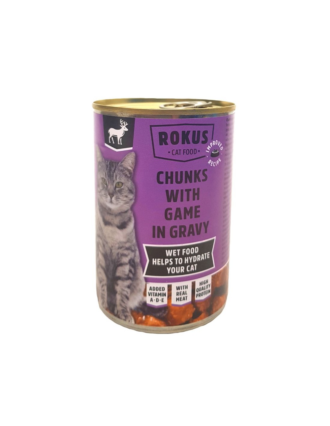Η Rokus με Κυνήγι είναι πλήρης υγρή τροφή για ενήλικες γάτες, με απολαυστικά κομμάτια κρέατος άγριου θηράματος σε πλούσια σάλτσα.